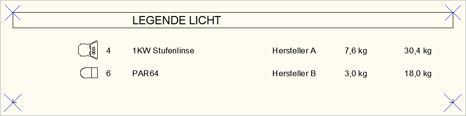 Nach der Wahl des Einfügepunktes wird die Masterlegende erzeugt. Der Einfügepunkt einer Legende ist immer die linke obere Ecke. So können Legenden verschiedener Gewerke untereinander angeordnet werden.