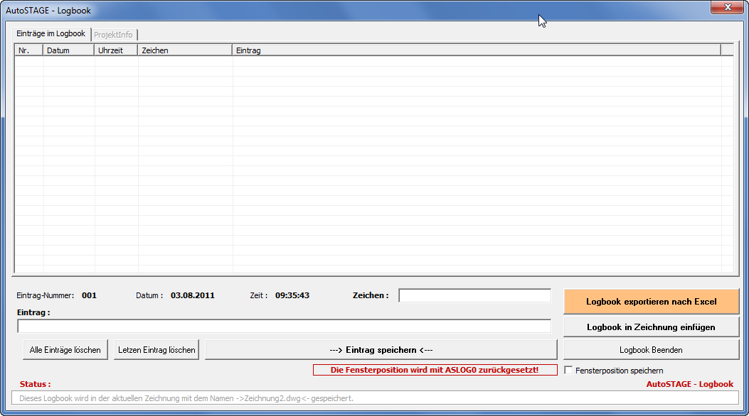 Alle Einträge werden unsichtbar in der Zeichnung gespeichert und stehen nach jedem Öffnen der Zeichnung über das Logbuch zur Verfügung.