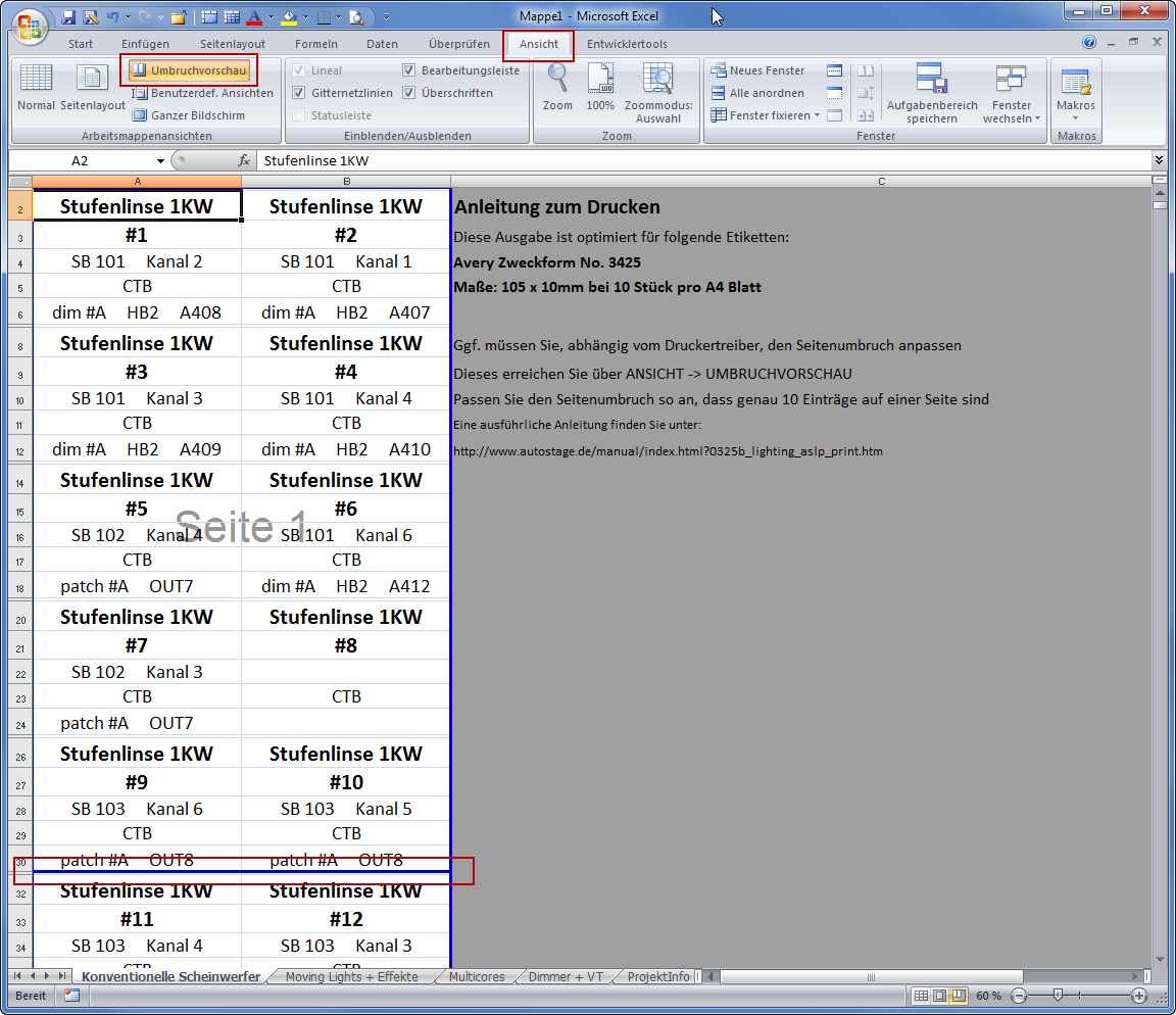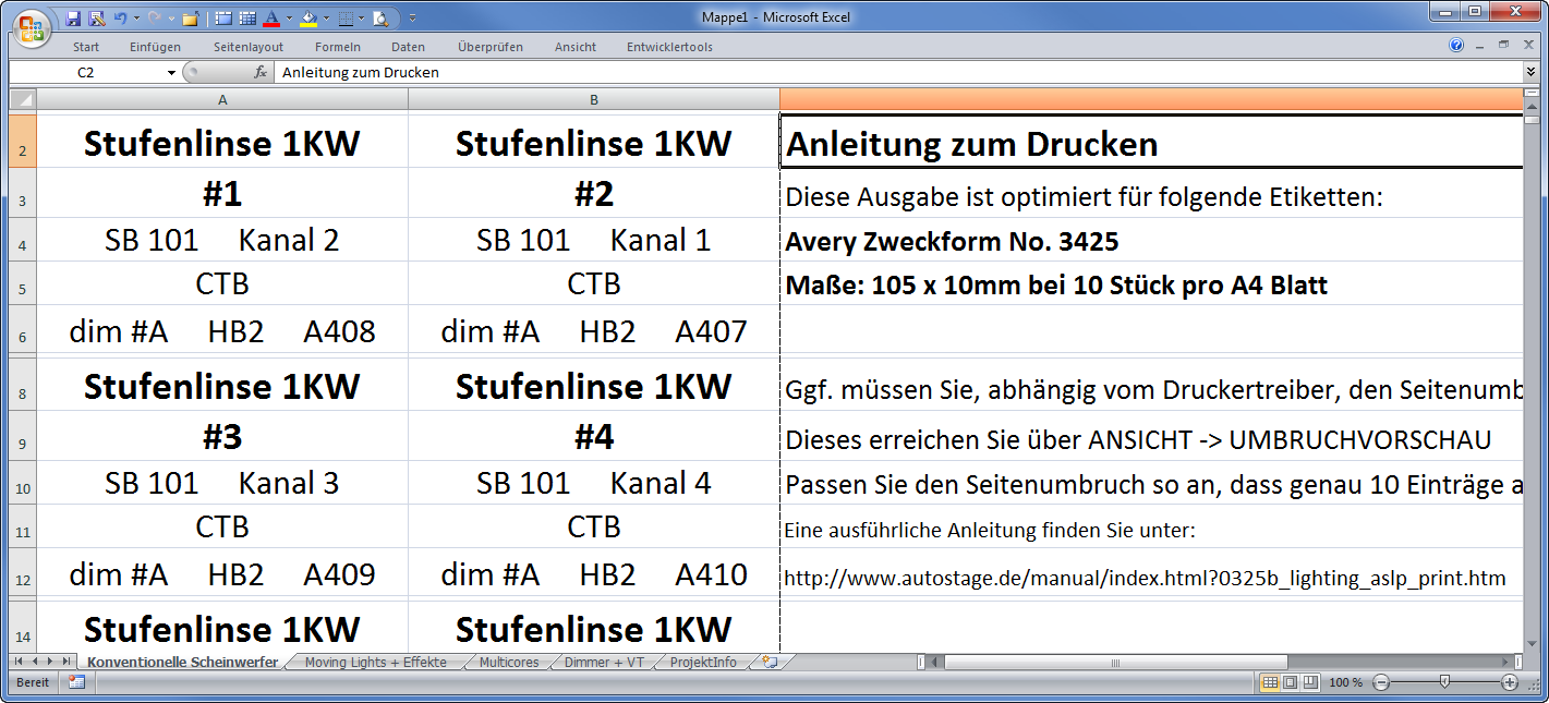 Über die mit ASLP erzeugte Patchliste lassen sich Etiketten für Scheinwerfer, Multicores und Dimmer/VT's drucken.