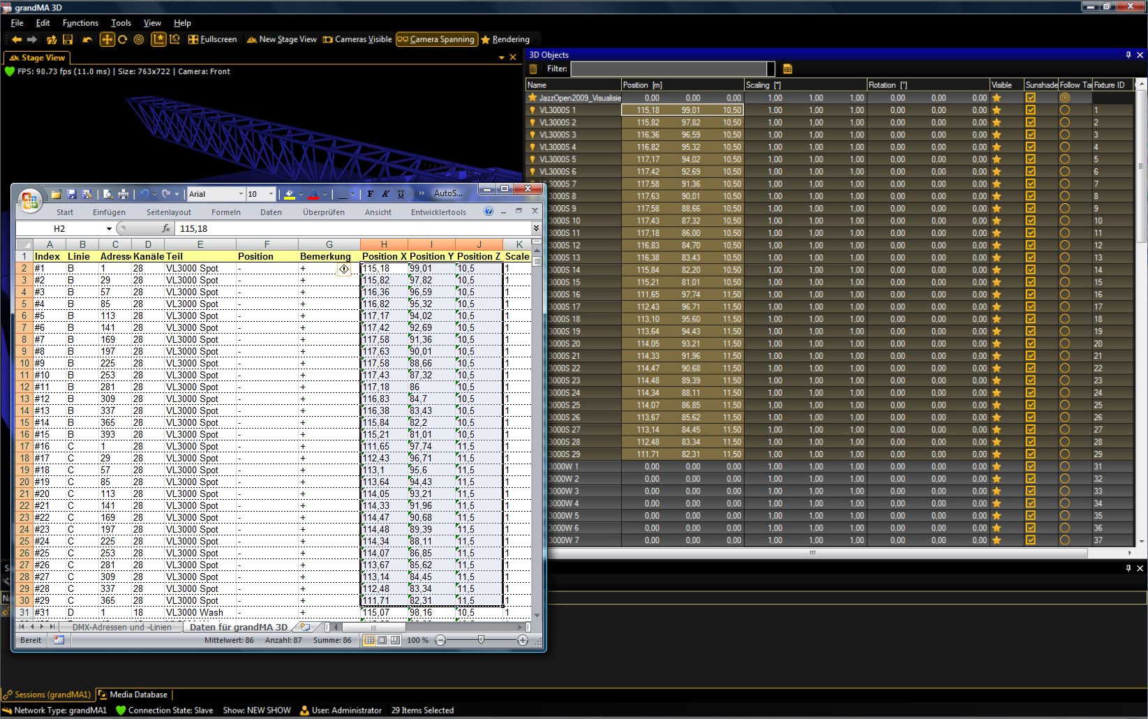 4.Verbindung zwischen grandMAonPC und grandMA 3D aufbauen und Positionsdaten mit STRG-C und STRG-V (Copy-Paste) aus der Excelliste in grandMA 3D übertragen.