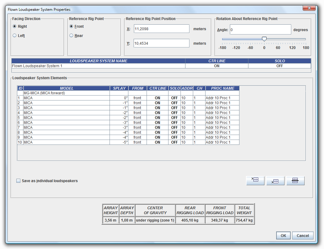 Auswahl des Systems und Eingabe der berechneten Einzelwinkel des Line-Arrays mit dem AutoSTAGE-Befehl ASLAR in AutoCAD: