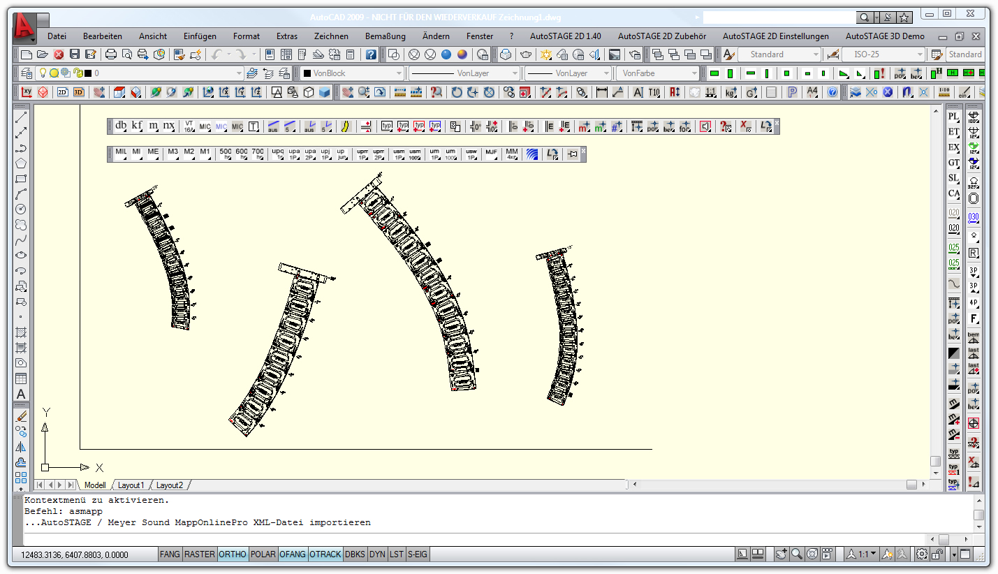 Nach der Auswahl und dem Laden der XML-Datei werden die Line-Arrays nach der Vorlage aus MappOnlinePro in AutoCAD konstruiert: |