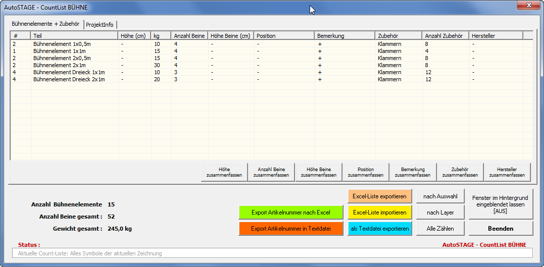 Wertet alle AutoSTAGE-Symbole des Bühnengewerkes in der Zeichnung aus und und zeigt diese in der Countliste an.