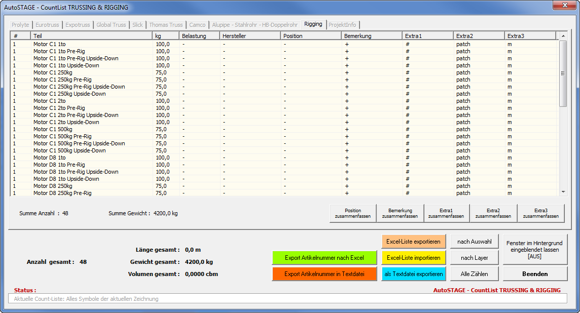 Wertet alle AutoSTAGE-Symbole der Gewerke Traversen und Rigging in der Zeichnung aus und und zeigt diese in der Countliste an.