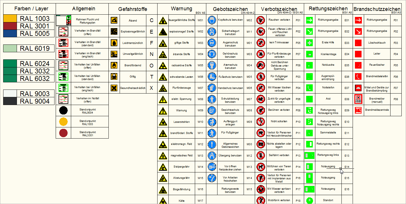 In der Bibliothek von AutoSTAGE sind eine Vielzahl von allgemeinen und speziellen Gebots-, Verbots- und Sicherheitssymbolen vorhanden. Diese können einzeln aus dem AutoSTAGE Zubehör Menü in eine Zeichnung eingefügt werden. Alternativ steht eine Übersicht über alle Symbole zur Verfügung. Diese wird mit dem "Grünen Kreuz"-Button aus dem Bankett+Zubehör-Werkzeugkasten geöffnet.