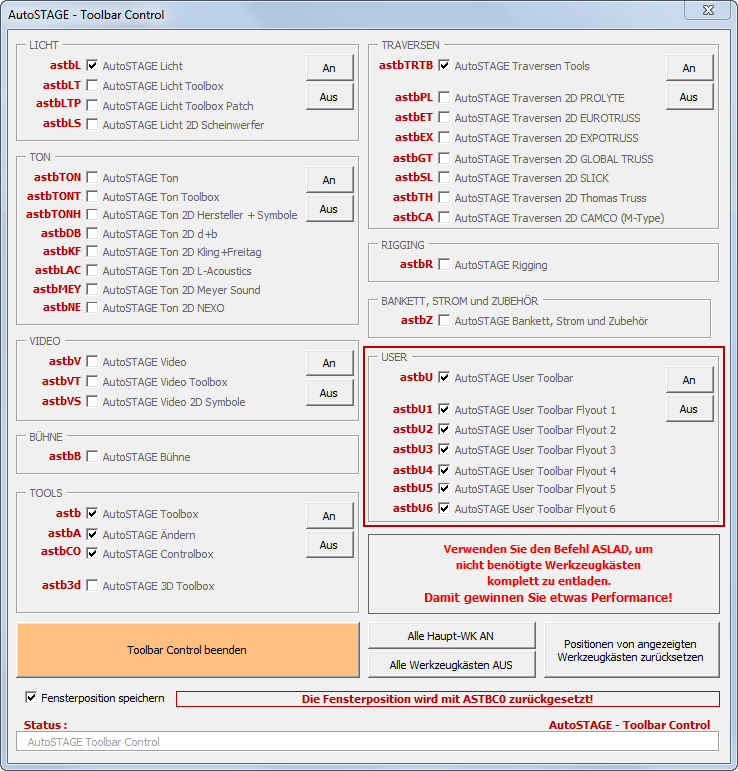 Die User-Toolbars können über die AutoSTAGE Toolbar Control (ASTBC) ein und ausgeblendet werden.