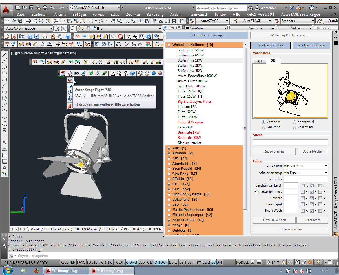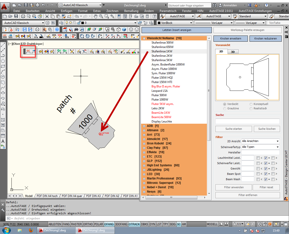 oStarten Sie den Licht Design Center mit ASDCL oWählen Sie einen Scheinwerfer aus der List aus oDas Einfügen des Scheinwerfers wird durch einen Doppelklick oder per Drag&Drop (halten und ziehen) gestartet oWählen Sie einen Punkt in der Zeichnung zum Einfügen oWählen Sie eine Drehung für den Scheinwerfer