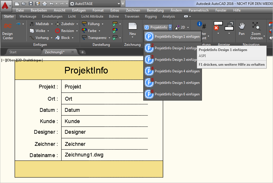 Beim Aufrufen der Befehle ASPI, ASPI2, ASPI3, ASPI4, ASPI5 oder ASPI6 werden nun die Projektinformation-Vorlagen AutoSTAGE_PROJECTINFO_V1.dwg bis AutoSTAGE_PROJECTINFO_V6.dwg aus dem Benutzerordner C:\CAD\MeineBenutzeranpassung verwendet.