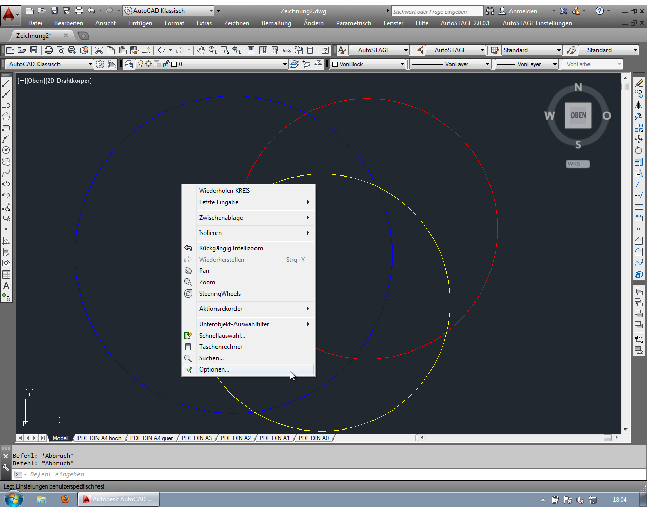Klicken Sie mit der rechten Maustaste auf einen freien Bereich in der Zeichnung. Es öffnet sich ein Kontextmenü, wählen Sie daraus den letzten Punkt Optionen.