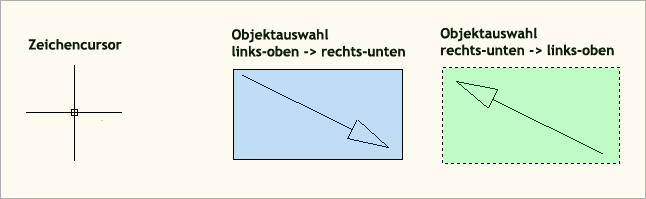 Mehrere Zeichnungsobjekte können durch Drücken und Halten der linken Maustaste sowie gleichzeitiger Bewegung des Fadenkreuzes ausgewählt werden. Dazu muss jedoch das Fadenkreuz an einer freien Stelle des Bildschirms positioniert sein. Bei der Bewegung des Fadenkreuz nach links-oben erscheint ein Auswahlbereich, der alle Objekte markiert, die den Auswahlbereichs berühren (Bild rechts). Wird der Cursor nach rechts-unten bewegt, erscheint ein Auswahlbereich, der nur Objekte markiert, die vollständig innerhalb des Auswahlbereichs liegen (Bild mitte).