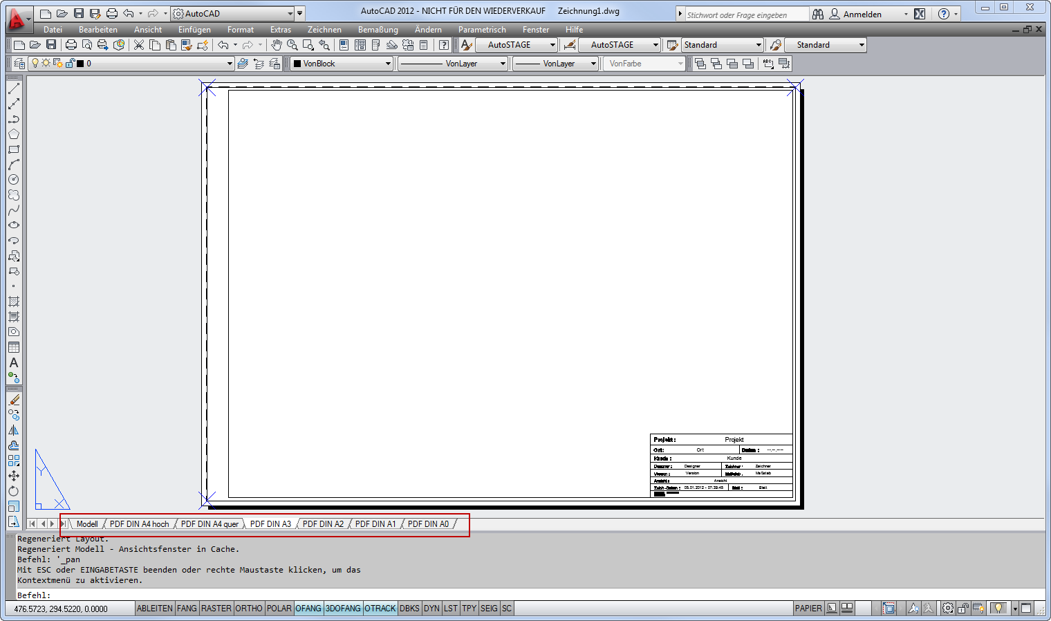 Eine wichtige Unterteilung bei der Arbeit mit AutoCAD ist die Aufteilung der Zeichnung in den Zeichenbereich (auch Modelspace oder Modellbereich genannnt) und den Druckbereich (auch Layout genannt). Alle Zeichenarbeiten finden im Zeichenbereich statt. Zum Drucken wird in den Druckbereich gewechselt, in dem Drucker, Papiermaß und alle weiteren Einstellungen für das Drucken festgelegt werden. Es können beliebig viele Layouts erstellt werden, während es immer nur einen Modellbereich in der Zeichnung gibt.