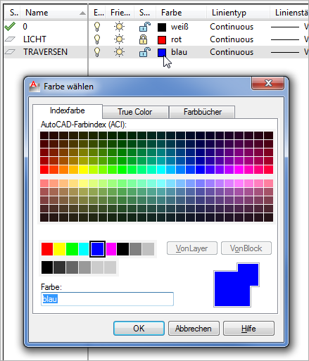 Die Farbe eines Objektes in der Zeichnung kann individuell über die Objekteigenschaften eingestellt werden. Die Farbe des Objektes kann aber auch über den Layer kommen, auf dem das Objekt liegt. Dafür muss die Farbe des Objektes auf VonLayer gestellt werden. Die Farbe des Objektes kommt nun über die Farbe des Layers und ändert sich immer dann, wenn die Farbe des Layers verändert wird.