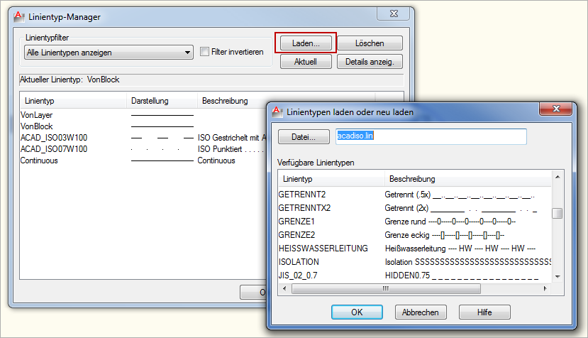 Im Linientyp-Manager können neue Linientypen geladen werden.