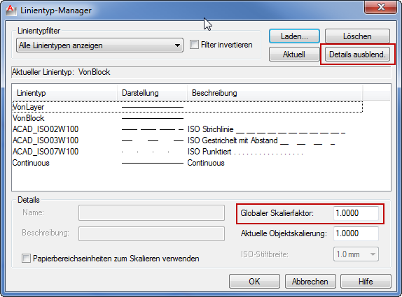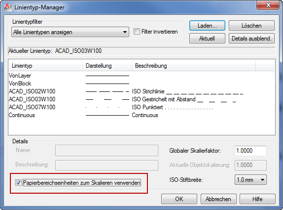 Über die Systemvariable PSLTSCALE mit dem Wert = 1 wird die Skalierung der Ansichtsfenster bei der Darstellung der Linientypen berücksichtigt. Der Linientyp wird dann in allen Ansichtsfenstern bei den verschiedenen Maßstäben gleich angezeigt. PSLTSCALE kann auch über den Linientyp-Manager eingestellt werden.