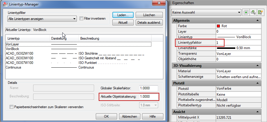 Der Linientyp VonBlock ist nur entscheidend, wenn aus dem Objekt in der Zeichnung ein Block erstellt werden soll. Der Linientyp des Blocks kann dann nur geändert werden, wenn intern die Elemente des Block den Linientyp VonBlock besitzen. Wenn ein anderer Linientyp eingestellt ist, dann kann der Linientyp des Blocks nicht verändert werden.