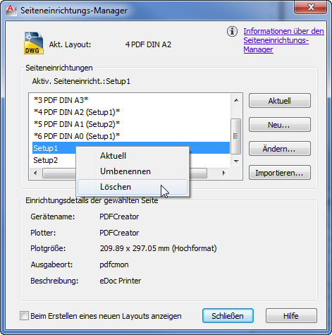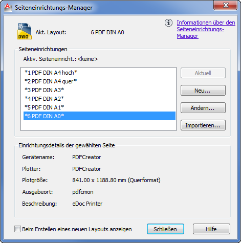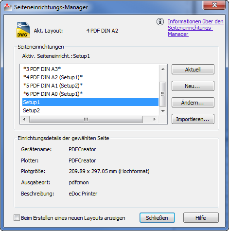 Die neu erstellte Seitenansicht erscheint in der Liste des Seitenansicht-Managers. Durch einen Doppelklick auf den Eintrag der Seiteneinrichtung oder durch Klicken auf den Button Aktuell wird die erstellte Seiteneinrichtung für das Layout übernommen, aus dem der Seiteneinrichtungsmanager über das Kontextmenü aufgerufen wurde. Der Name der Seiteneinrichtung erscheint dann in Klammern hinter dem Layoutname (z.B. * 5 PDF DIN A1(Setup2)*). Es können für das gewählte Layout auch die Einstellungen von anderen Layouts übernommen werden. Dies geschieht ebenfalls durch Doppelklick auf den Layoutnamen oder über Aktuell.