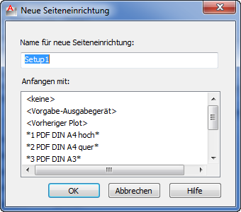 Im Fenster Neue Seiteneinrichtung wir der Name für die Seiteneinrichtung eingegeben. Ebenfalls kann ein Layout oder eine andere Seiteneinrichtung über Anfangen mit: als Vorlage für die neue Seiteneinrichtung verwendet werden.