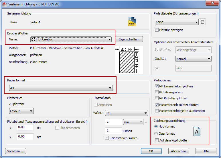 Nach Klicken auf OK öffnet sich das Fenster der Seiteneinrichtung, in dem der Drucker, das Papierformat und die Zeichnungsausrichtung eingestellt wird. Alle weiteren Einstellungen können erst einmal so übernommen und ggf. später angepasst werden. Die Änderungen werden durch Klicken auf OK übernommen.