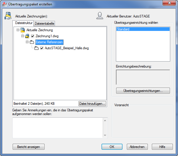 Dieses Paket kann als ZIP-Datei erstellt werden, welches unmittelbar bereit für die Versendung ist. Alle Referenzpfade im Übertragungspaket werden so aufgelöst, dass der Empfänger die Zeichnung allen Referenzen laden kann, ohne selber Pfade ändern oder manuell die externen Referenzen zu müssen. Über den Button Übertragungseinrichtungen... können die Parameter für die Erstellung eines Übertragungspakets angepasst werden.