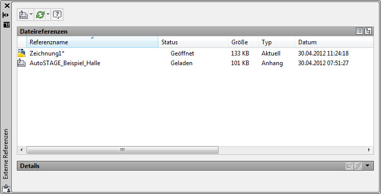 Über die Palette Externe Referenzen werden alle Referenzen in der Zeichnung verwaltet. Die Palette Externe Referenzen wird über Einfügen->Externe Referenzen... oder über Extras->Paletten->Externe Referenzen... angezeigt. In der Palette Externe Referenzen... kann auch der Pfad einer XREF nach einer Änderung des Pfads angepasst werden.