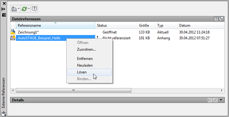 Durch Selektion und Drücken der ENTF-Taste kann eine XREF aus einer Zeichnung gelöscht werden. Der Layer, auf dem die XREF liegt, muss dabei entsperrt sein. Trotz des Löschens der XREF in der Zeichnung bleibt ein Eintrag in der Palette Externe Referenzen.. erhalten. Um die externe Referenz vollständig aus der Zeichnung zu entfernen, muss dieser gelöst werden.