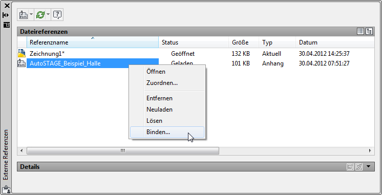 Externe Referenzen auf DWG-Dateien können fest an die Zeichnung gebunden werden. Die externe Referenz wird dabei aufgelöst und alle Informationen der externen Referenz in die aktuelle Zeichnung geschrieben. Dieses ähnelt dem Einfügen von einem Block in die Zeichnung.