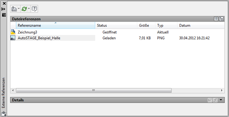 Über die Palette Externe Referenzen werden alle Referenzen in der Zeichnung verwaltet. Die Palette Externe Referenzen wird über Einfügen->Externe Referenzen... oder über Extras->Paletten->Externe Referenzen... angezeigt. In der Palette Externe Referenzen... kann auch der Pfad eines Pixelbilds nach einer Änderung des Pfads angepasst werden.