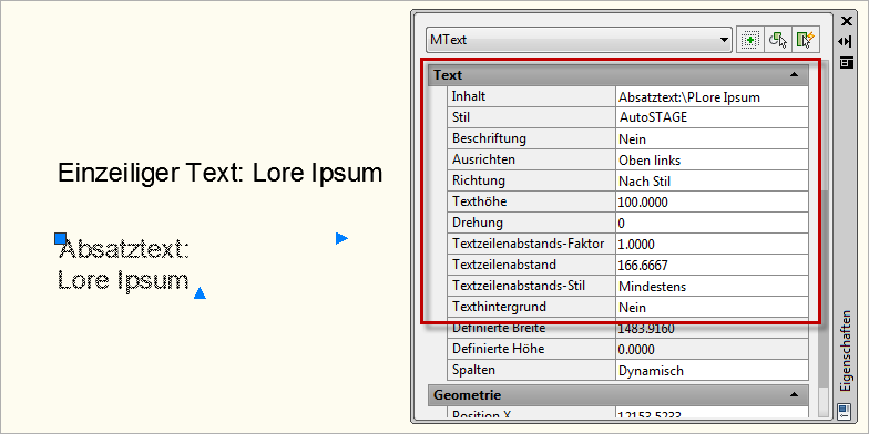 Ein Text kann entweder als Absatztext oder als einzeiliger Text in die Zeichnung eingefügt werden.