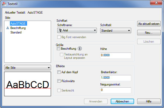 Wenn der Textstil bei einer Bemaßung verwendet wird, dann muss die Höhe des Textstils 0.0000 betragen, damit der Bemaßungsstil die Höhe des Bemaßungstexts skalieren kann.