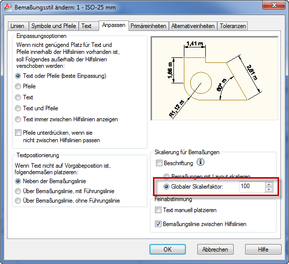Folgende Skalierfaktoren sorgen für eine optimale Größe von Bemaßungen im Modellbereich wie auch in den Layouts.