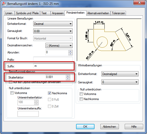 Die Primäreinheiten bestimmen, mit welchem Einheitenzusatz das Längenmaß der Bemaßung angegeben wird.