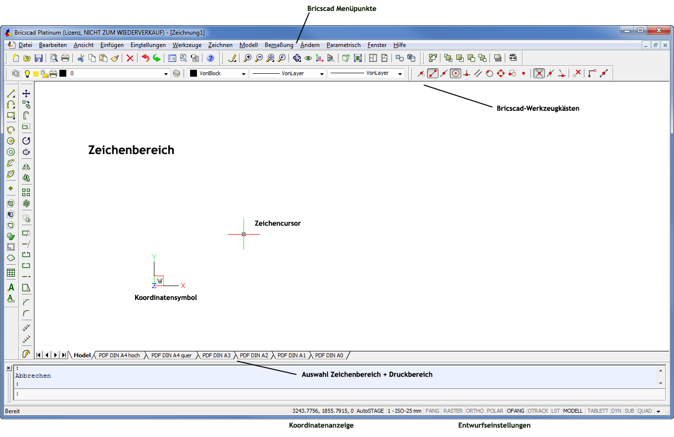 Der Zeichenbereich oder auch Modellbereich mit den Zeichnungsfenstern nimmt den größten Teil des Bricscad-Fensters ein. Es können eine oder mehrere Zeichnungsfenster auf der Zeichnungsfläche geöffnet und diese überlappend, nebeneinander oder übereinander am Bildschirm angeordnet werden. Ein Fenster kann auch maximiert werden, damit es die gesamte Zeichnungsfläche ausfüllt. Alles, was während einer Sitzung erstellt wird, erscheint im aktiven Zeichenfenster. Es gibt immer nur einen einzigen Modellbereich in der Zeichnung.