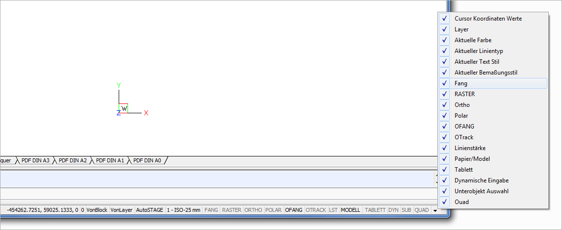 Neben der Koordinatenanzeige befinden sich im unteren rechten Bereich die Schaltflächen der Entwurfseinstellungen. Durch das Klicken mit der rechten Maustaste auf eine Schaltfläche der Entwurfseinstellungen kann auf die Eigenschaften und verschiedene Optionen der entsprechenden Entwurfseinstellung zugegriffen werden.