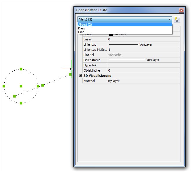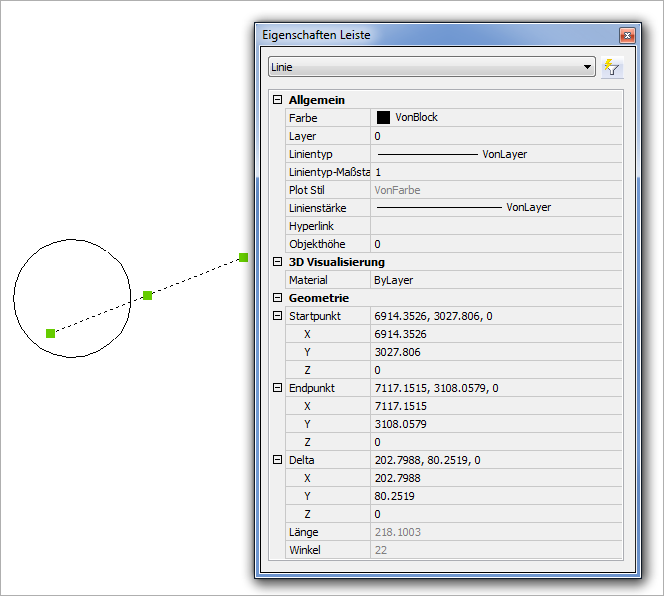 Die Eigenschaften eines Objekte in der Zeichnung werden in der Eigenschaften-Leiste angezeigt, wenn das Objekt in der Zeichnung selektiert wird.
