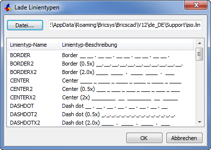 Linientypen werden in einer ASCII-Datei mit der Endung .lin mit einem bestimmten Code beschrieben. Bricscad wird mit zwei Linientyp-Dateien ausgeliefert: odefault.lin mit Linientypen für imperialen Zoll Maße oiso.lin mit Linientypen für metrische Maße Die Systemvariable MEASUREMENT speichert, welche der beiden Linientypen-Dateien verwendet wird. MEASUREMENT sollte auf 1 stehen, damit Linientypen im metrischem Maß verwendet werden. Die Einstellung von MEASUREMENT wird in jeder Zeichnung individuell gespeichert.