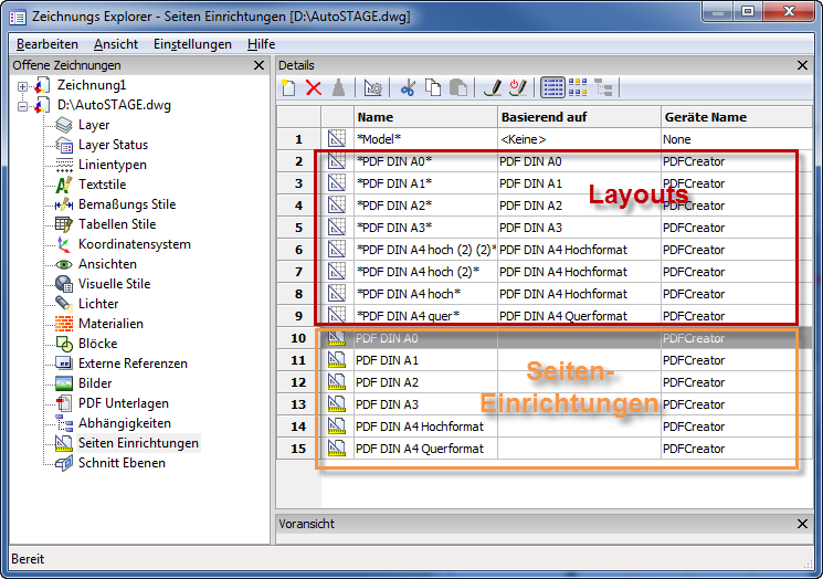 Es können Seiteneinrichtungen mit festgelegten Druckereinstellungen (z.B. Format und Drucker) erstellt werden. Eine Seiteneinrichtung kann beliebig vielen Layouts zugeordnet werden. Mit Seite einrichten... über das Kontextmenü im Layout-Bereich wird der Zeichnungs-Explorer mit den Seiteneinrichtungen geöffnet.