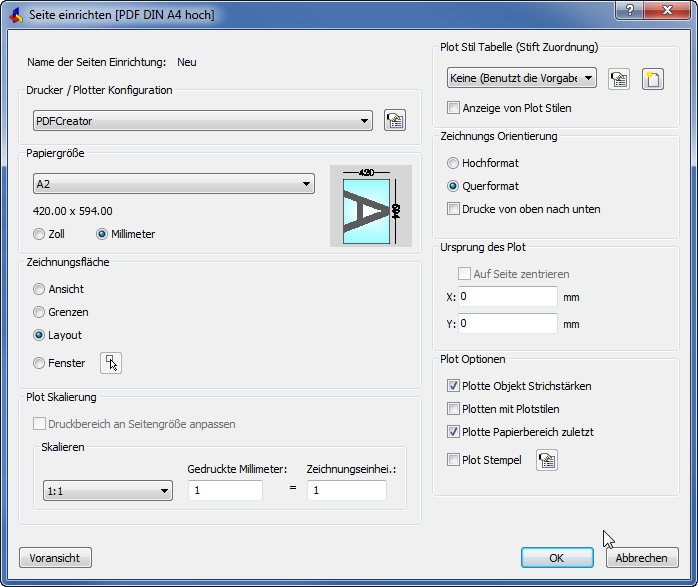 Nach Klicken auf Erzeugen... öffnet sich das Fenster der Seiteneinrichtung, in dem der Drucker, das Papierformat und die Zeichnungsausrichtung eingestellt wird. Alle weiteren Einstellungen können erst einmal so übernommen und ggf. später angepasst werden. Die Änderungen werden durch Klicken auf OK übernommen.