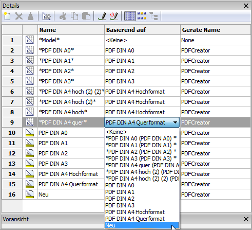 Die neu erstellte Seitenansicht erscheint in der Liste im Zeichnungs-Explorer. Die Seiteneinrichtung wird geändert, in dem mit einem Doppelklick in den anderen Spalten der Seiteneinrichtung geklickt wird.