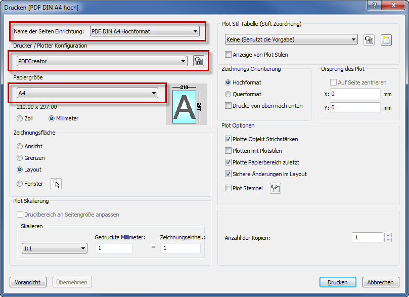 Über Drucken... aus dem Kontextmenü eines Layouts oder mit STRG-P wird ein Layout gedruckt. Das Kontextmenü wird über die rechte Maustaste aus dem Layout aufgerufen.