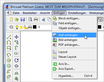 •aus dem Menü über Einfügen->XREF anhängen oder mit dem Befehl XZUORDNEN