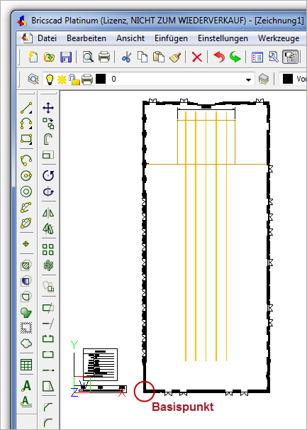 •Einen Punkt in der Zeichnung auswählen, an dem die XREF eingefügt werden soll. Die XREF besitzt einen sog. Basispunkt, welcher der Einfügepunkt der XREF in der Zeichnung kennzeichnet. Der Basispunkt kann durch separates Öffnen der XREF-Datei mit dem Befehl BASIS bestimmt werden.