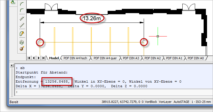 Anhand des Meßwerts des Referenzmaß wird festgestellt, dass die XREF im Millimetermaßstab angelegt ist und entsprechend in der Zeichnung eingefügt wurde (1000 Zeichnungseinheiten = 1m / 13256.8488 ZE = 13.26m).