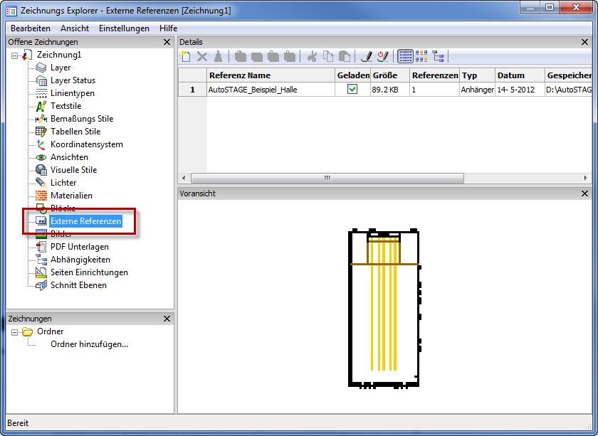 Über den Zeichnungs-Explorer (Werkzeuge-> Zeichnungs-Explorer->XRefs...) werden alle Referenzen in der Zeichnung verwaltet. Im Zeichnungs-Explorer kann auch der Pfad einer XREF nach einer Änderung des Pfads angepasst werden.