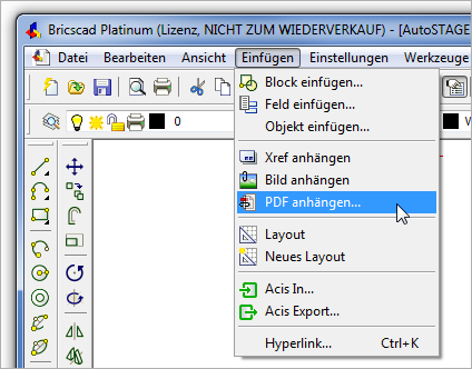Eine PDF-Datei wird als Verknüpfung in die Zeichnung eingefügt (ab Bricscad 2010). Die PDF wird in der Zeichnung selektiert, in dem der Rand der PDF ausgewählt wird. Wenn eine PDF im Vektorformat erstellt wurde, können in der PDF die verschiedenen Fang-Modi verwendet werden.