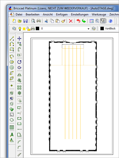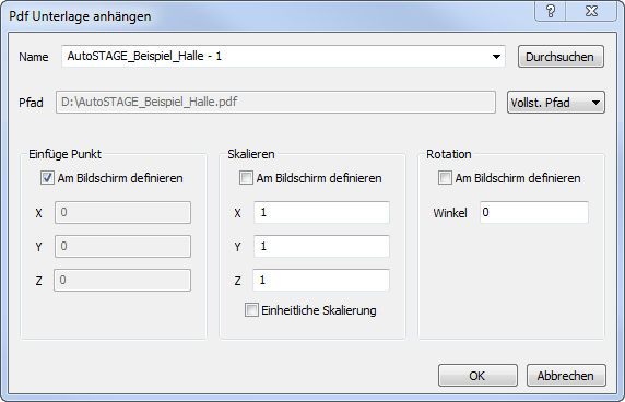 oSkalieren der PDF (siehe Bestimmen des 1:1 Maßstab mit Abstand). Dieser Schritt ist absolut notwendig, da die Skalierung nicht mit dem in der Zeichnung verwendeten Maßstab übereinstimmt. Die Skalierung kann nur gelingen, wenn in der PDF ein Referenzmaß vorhanden oder wenn die Länge eines Zeichnungselements aus der PDF (z.B. die Länge der Bühnenvorderkante) bekannt ist.