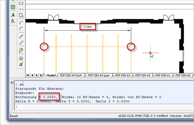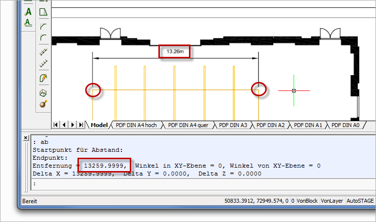 Anhand des Meßwerts des Referenzmaß wird festgestellt, dass die PDF um den Faktor 4340,4255 ( FAKTOR = Zielmaß/Meßwert = 13260mm/3,0550mm) mit dem Skalieren-Befehl (V) vergrößert werden muss, damit die PDF für den Millimetermaßstab skaliert ist (1000 Zeichnungseinheiten = 1m / 13260 ZE = 13.26m) (siehe Abweichende Messung vom Referenzmaß).
