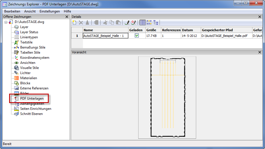 Über den Zeichnungs-Explorer (Werkzeuge-> Zeichnungs-Explorer->PDF-Unterlagen...) werden alle PDF-Unterlagen in der Zeichnung verwaltet. Im Zeichnungs-Explorer kann auch der Pfad einer PDF-Datei nach einer Änderung des Pfads angepasst werden.