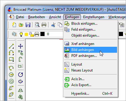 •aus dem Menü über Einfügen->Bild anhängen... oder mit dem Befehl BILDZUORDNEN