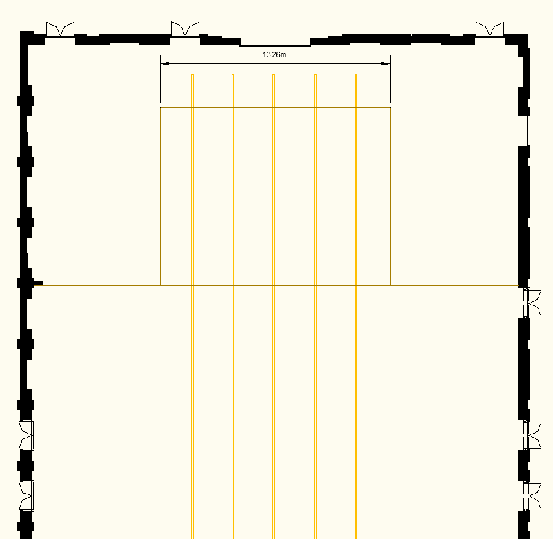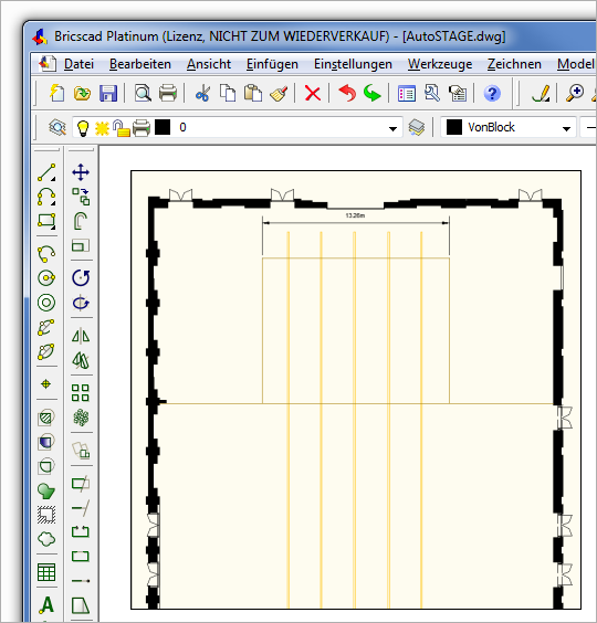 oSkalieren eines Pixelbilds (siehe Bestimmen des 1:1 Maßstab mit Abstand). Dieser Schritt ist absolut notwendig, da die Skalierung nicht mit dem in der Zeichnung verwendeten Maßstab übereinstimmt. Die Skalierung kann nur gelingen, wenn in dem Pixelbild ein Referenzmaß vorhanden oder wenn die Länge eines Zeichnungselements aus dem Pixelbild (z.B. die Länge der Bühnenvorderkante) bekannt ist.