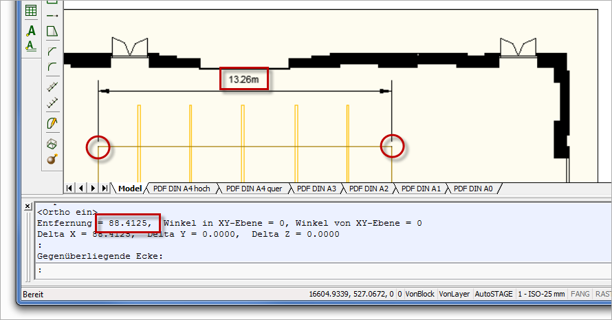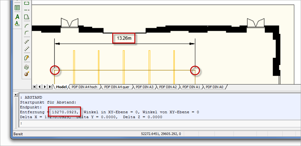 Anhand des Meßwerts des Referenzmaß wird festgestellt, dass das Pixelbild um den Faktor 149,9788 ( FAKTOR = Zielmaß/Meßwert = 13260mm/88,4125mm) mit dem Skalieren-Befehl (V) vergrößert werden muss, damit das Pixelbild für den Millimetermaßstab skaliert ist (1000 Zeichnungseinheiten = 1m / 13260 ZE = 13.26m) (siehe Abweichende Messung vom Referenzmaß). Eine absolut genaue Skalierung ist mit einem Pixelbild nicht möglich!